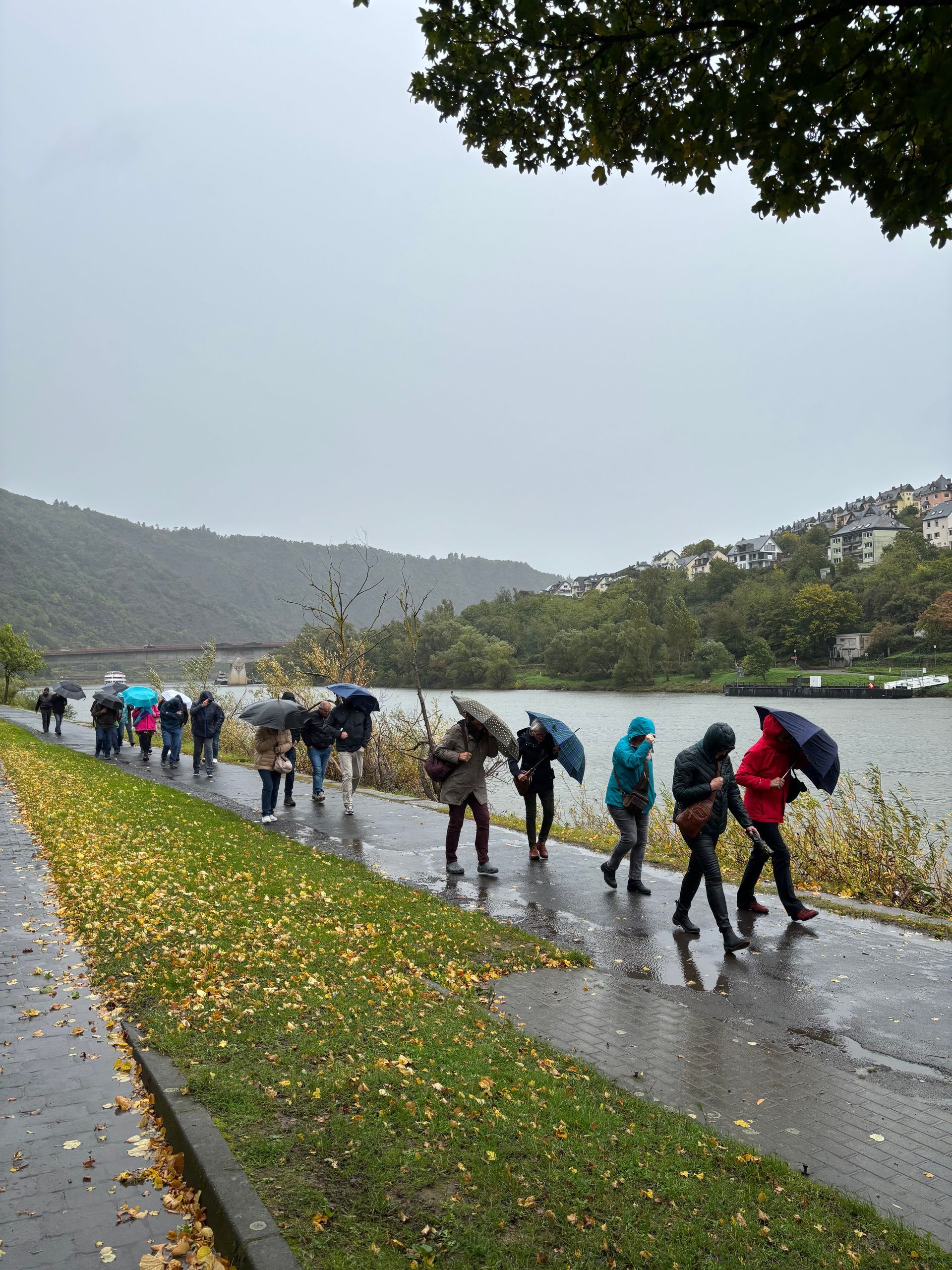 Wenig später musste dann die erste Herausforderung gemeistert werden - gemeinsam ging es von der Bushaltestelle durch Regen und Wind fußläufig zur Schiffsanlegestelle an der Mosel. Man konnte dann ziemlich schnell wieder in glückliche Gesichter schauen, als sich alle an Bord des „Moselprinzen“ befanden, um dort im trockenen Innenraum Platz zu nehmen. Bei der einstündigen Panoramarundfahrt fuhr man an einigen Dörfern rund an der Mosel vorbei und konnte über Lautsprecher interessante Informationen erfahren. Auch das Wahrzeichen der Stadt Cochem, die Reichsburg, konnte vom Schiff aus schon gesehen werden.